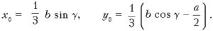 Из геометрии известно, что длина отрезка OD составляет 1/3 длины медианы AD (точка пересечения медиан отсекает медианы со стороны ее конца). Отсюда немедленно следует (например, рассмотрением подобных прямоугольных треугольников DAF и DОx0), что координаты x0, y0 точки O, т.е. ц.м., составляют координаты вершины A, которые определяются отрезками AF и DF: